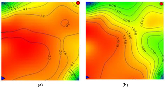 The three-dimensional slab model experiment is applied to determine the viscosity and concentration distribution after the polymer flooding. The relationship between viscosity of the polymer solution and concentration is shown in Figure 8. The viscosity distribution is shown in Figure 9a with units of mPa·s, while the concentration distribution is shown in Figure 9b with units of mg/L. The