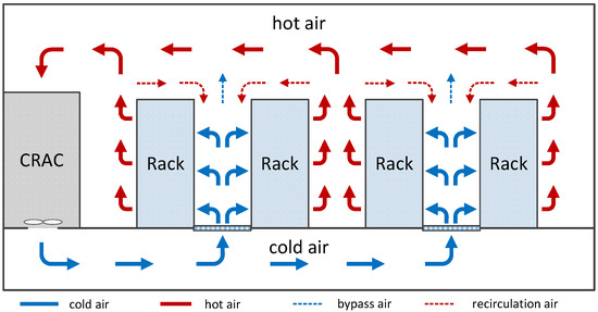 Currently, air-cooled data centers usually adopt a raised-floor configuration to maintain an appropriate temperature and humidity condition, as illustrated in Figure 1. The racks placed on the plenum are usually arranged in a cold aisle–hot aisle layout. Supply air from a computer room air conditioner (CRAC) enters the plenum and is then distributed into the cold aisle through perforated tiles. The racks extract air from the cold aisle and exhaust it into the hot aisle. The cold air flows through the server rack and removes the heat generated by the IT equipment. Finally, the exhaust air of the racks returns to the intake of the CRAC to complete a cycle. The cold aisle–hot aisle structure separates the flow paths of hot air and cold air. However, the recirculated air from the hot aisle and the escaped air from the cold aisle are still present. Hot-air recirculation causes an elevated temperature at the server inlet and forms some localized hot spots around the server racks. In order to cool these localized hot spots, the CRAC has to blow excessive cold air into the whole room. The high utilization of the CRAC not only leads to more energy consumption but also affects the efficiency through reducing its coefficient of performance (COP).