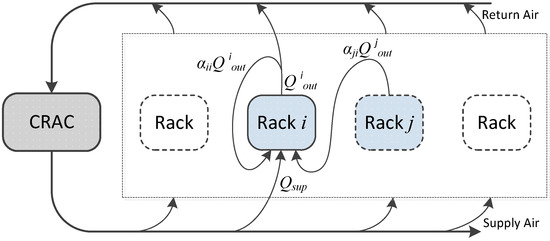 According to the air recirculation among racks, as shown in Figure 2, the amount of air from the CRAC drawn by the node i inlet per unit time is written as , and consequently, we have