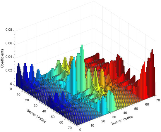 In order to use the cross-interference coefficients to characterize the heat recirculation ratio among the server chassis, virtual tracers were introduced in the CFD simulation [35,36]. We added the virtual tracers at the outlet of each server chassis. The air recirculation ratio could be calculated by measuring the concentrations of these tracers at each server inlet. The cross-interference matrix obtained by CFD simulation is shown in Figure 4. Because the cross-interference coefficient among the server chassis is determined by the geometry layout, the matrix is calculated once for a data center.
