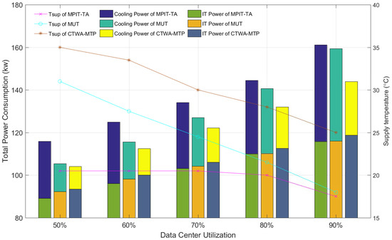 Figure 5 shows the power consumption profile of the data center with different utilizations. We observe that the CTWA-MTP consistently had the minimal total power consumption and the maximum supply temperature. In addition, MPIT-TA had the worst energy efficiency and the lowest supply temperature under all of the utilizations. Figure 5 also shows that the supply temperatures of the CTWA-MTP, MUT and MPIT-TA increased as the data center utilization decreased, but that the supply temperature of MPIT-TA did not further increase when the data center utilization was below 70%. This was because the static power of the server made the MPIT-TA algorithm unable to further minimize the peak inlet temperature when the data center was running at low utilization. Figure 5 shows that the workload allocation strategy achieved a lower total power consumption with higher IT equipment power; this means the increment in the IT equipment power cannot counteract the saving of cooling power. We observe that the total power of MUT was higher than for CTWA-MTP and was lower than for MPIT-TA; this implies that the performance of the workload allocation methods based on the chip temperature, such as MUT and the CTWA-MTP, is better than that of the workload allocation methods based on the inlet temperature. Moreover, compared to MUT, the CTWA-MTP further improves the energy efficiency of data centers by optimizing the workload distribution among servers, particularly under high data center utilization.
