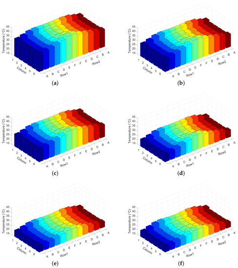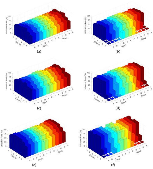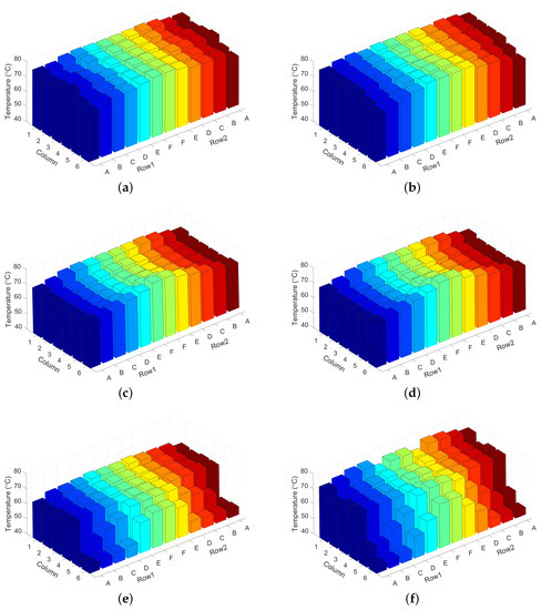 Figure 6 shows the chip temperature distributions achieved by different methods under 60% and 80% utilizations. The server racks in each row were numbered from 1 to 6; a rack with a smaller number was closer to the CRAC and that with a larger number was farther away from the CRAC. In each rack, the server chassis were numbered from A to F; chassis A was at the bottom and chassis F was at the top. Because the workload allocation was optimized with respect to the chip temperature, we could intuitively observe that the chip temperatures of the CTWA-MTP were higher and more uniform than those of MUT or MPIT-TA. For the chip temperature distribution of MUT as shown in Figure 6c,d, the chip temperatures of columns 1 and 6 were higher than others because of the heat recirculation. In comparison to the chip temperature distribution of the CTWA-MTP and MUT, the chip temperature of MPIT-TA was lower, particularly at the bottom of columns 5 and 6. This was because MPIT-TA tends to reduce the workload from the largest contributors of heat recirculation to keep the peak inlet temperature below the threshold, although the low utilization of the server allows for a higher inlet temperature.