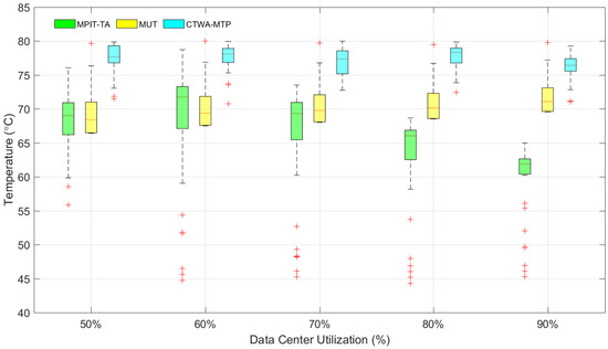 Figure 7 shows the boxplot of the chip temperature distributions under all of the utilizations. Boxplotting is a tool aimed at graphically illustrating some quantiles and the spread of a set of variables. We observe that the chip temperatures of MPIT-TA were spread over a large range, and some temperatures were far below the threshold, particularly in the case of high utilization (e.g., some chip temperatures of MPIT-TA were below 50 C, which means that the servers were overcooled). Compared with MPIT-TA, the chip temperature distributions achieved by MUT were mainly concentrated from 65 to 75 C, and the chip temperature distributions achieved by CTWA-MTP were concentrated from 75 to 80 C. This means that the CTWA-MTP prevents the servers from overcooling and makes full use of the cooling capacity of cold air. In addition, a higher chip temperature results in a higher leakage power; thus CTWA-MTP, MUT and MPIT-TA have different IT equipment power under the same utilization. The results contained in Figure 7 confirm the observation results shown in Figure 6.