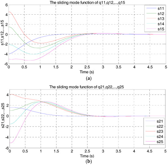 Response of sliding mode function of multi-agent system with q1i, q2i, respectively. (a) Response of s1l; (b).Response of s2l.