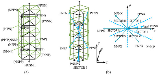 In the three-dimensional coordinate system of a three-phase four-leg inverter, there are six prisms to represent the switching voltage vectors. These prisms can be divided into six sectors (from I to VI) such that each sector is combined with half of the two adjacent prisms, as shown in Figure 2a. The projection of the reference vector on the αβ coordinate is used to determine the sector of the reference vector. There are six active vectors and two zeros vectors in each sector.