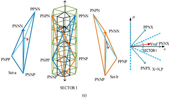 In order to reduce the CMV and utilize high DC-link voltage, six active switching vectors are selected to synthesize the reference in each sector. As shown in Figure 2b, all of the sectors occupied 60° on the αβ plane, with sector I in the range of 330° to 30°, and followed by the other sectors. In order to minimize the current and harmonic content, near state switching vectors should be selected that are adjacent to the reference vector. It is seen that two prisms in each sector consist of two tetrahedrons, and there are eight switching vectors adjacent to the reference vector, four of which are selected based on the minimization of CMV and switching loss. The position of the reference vector is determined by the NSV-MPC at every sampling period. The active voltage vectors surrounding the determined reference vector are selected based on the position of the reference voltage vector. The optimal vector candidate is included among the selected voltage vectors. As shown in Figure 2c, if the reference switching vector is in sector I, four non-zero switching vectors are required to synthesize the reference vector. Therefore, two sets (Set-a and Set-b) of four switching vectors are selected in each sector. It is clear that two switching vectors (PNNP and PNNN) are chosen in both sets. Hence, there are six different switching vectors in one sector.
