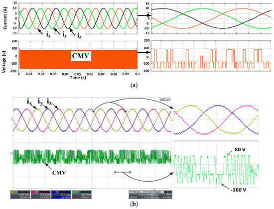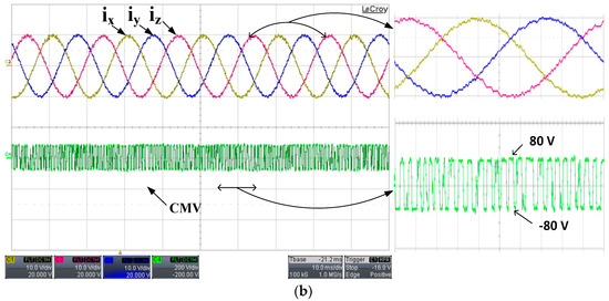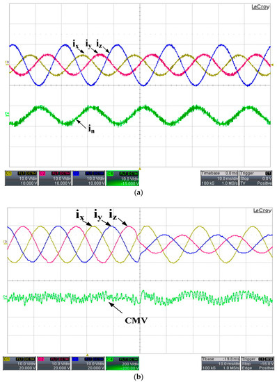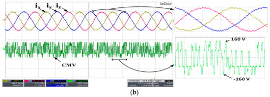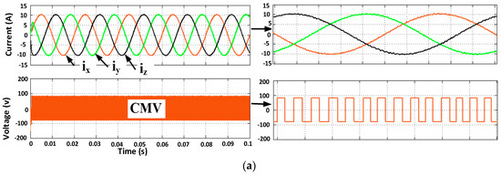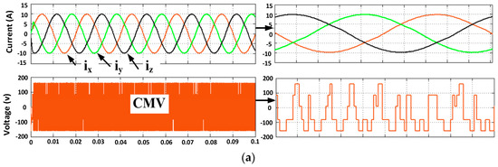 In the third case, the proposed NSV-MPC was applied by using only six active vectors in each sampling instant to significantly reduce the peak-to-peak value of the CMV. Consequently, the calculation burden is also reduced through using a reduced number of switching vectors. Even though the ripple content in the load current is marginally higher than in Case 2, it is still in an allowable range. The CMV is confined within ±, as shown in Figure 7.