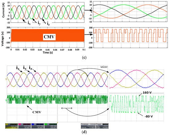 Each phase current and CMV for Case 2, first considering PPPP as the switching state: (a) Simulation result, (b) Experimental result; and considering NNNN as the switching state (c) Simulation result, (d) Experimental result (I = 10 A/div., CMV = 200 V/div. and 10 ms/div.).