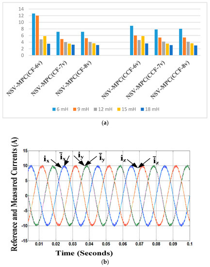 The controller accuracy depends on the system parameters and the discrete predictive model. The effectiveness of the NSV-MPC was tested through robustness analysis by varying the system parameters. The response of the proposed system against the inductive filter variation was validated through both simulation and an experiment. Two cases were carried out: (a) CF: Change in inductive filter but no change in controller, where the filter’s inductance changed from 6 mH to 18 mH without providing the information of the filter changes to the controller. (b) CCF: Changes to both the filter as well as to the controller, where the changed filter values are given to the controller to evaluate the effectiveness. In Figure 10a, the percentages of total harmonic distortion (THD) with respect to the variation of inductive value have been shown.