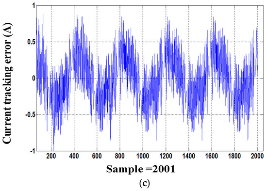 Each leg of the three-phase four-leg inverter generated an independent voltage to control the zero-sequence voltage or current. The reference current tracking error of the proposed control scheme is very accurate. Figure 10b shows the reference and measured currents, and Figure 10c shows that the tracking error of current () in phase x is confined within ±0.82 A. The percentage of reference tracking error with respect to the load current can be calculated from the reference and load current as follows: