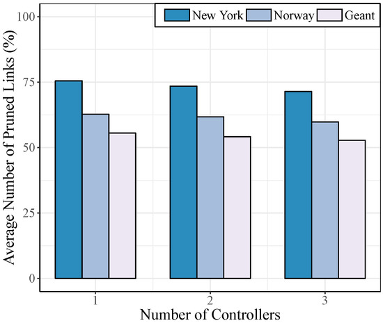 Although higher values of are expected when the bound of nodes that will remain connected to the controller is increased, this is not always the behavior that can be appreciated in the table for the three network scenarios considered. The reason for this is that every network node, which is considered in one particular instance of the simulation as the controller, does not have the same node degree. Thus, for each considered possibility of , different amounts of nodes are part of the presented average values.