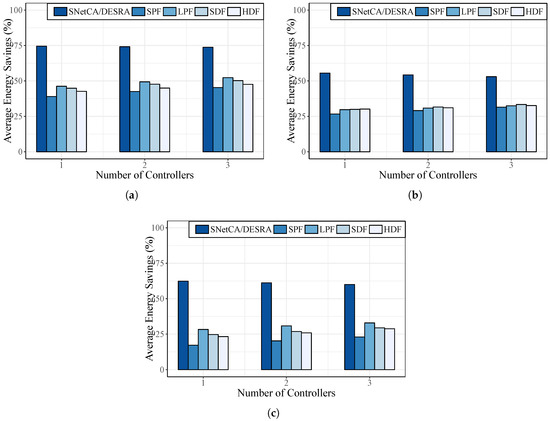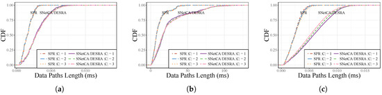 As shown in Figure 9a–c, the CDFs of data paths’ latencies for different amounts of controllers are quite similar. However, we can see that under the energy-aware routing, data path delay is affected since larger data paths are used in order to minimize the number of active links. For instance, in Figure 9b, only 87% of data paths exhibit delays lower than 50 ms, meanwhile all control paths in the SPR case are under this value. This performance degradation is less critical in the two other topologies, which are deployed in smaller geographic areas compared to Geant. In general, the larger the network (in terms of geographic length), the more increase in latency is incurred.