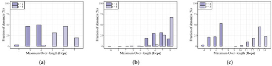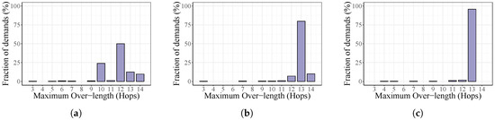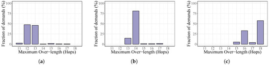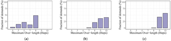 As is shown in Figure 10 under the delay-constrained approach, the control traffic can be routed incurring smaller over-lengths with respect to the performance-agnostic approach. Similarly, Figure 11 shows that the data paths latency are less compromised when more restrictive possibilities in terms of latency ( and 5) are considered. In general, the more restrictive is the latency bound used, the better the performance in terms of delay can be achieved.