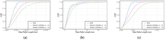 Cumulative distribution function of data paths latency for one controller under delay constraint in the: (a) New York topology; (b) Geant topology; and (c) Norway topology.