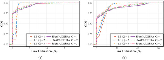Cumulative distribution function of link utilization varying the amount of controllers in the: (a) New York topology; and (b) Geant topology.