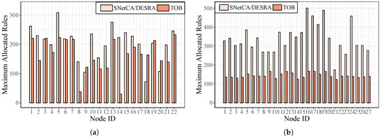 In Figure 13, we evaluate the impact of our approach on TCAM occupation with respect to the TOB algorithm using the Geant and Norway topologies and all possible locations of two network controllers.