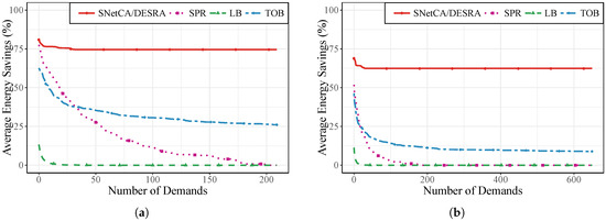 As expected, in all cases, energy savings decrease while the number of demands grows. This is due to the fact that new paths need to be established to accommodated such traffic. The flat tendency of energy savings achieved by the power-aware solution despite the increase in allocated demands is possible given the low network load discussed at the beginning of this section. Moreover, the proposed strategy greatly outperforms SPR, LB and TOB in terms of energy saving. In general, SNetCA/DESRA is able to achieve significant energy savings, but bigger improvements with respect to the other approaches are reached when the traffic grows.
