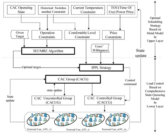 Figure 1 gives a brief description of the optimal coordinated framework SEUMRE and IPPL method. The CAC group (CACG) is divided into two operating groups: CAC Uncontrolled Group (CACUG) and CAC Controlled Group (CACCG) based on price constraints, given optimal target and the states of terminal users at every simulation time step. An integrated-parameter-priority-list control strategy is used to generate the control command for every controlled terminal user. Taking historical switching number, current price and indoor temperature, users’ willingness, and CAC’s operating status into consideration, the integrated parameter aiming to describe the status of CAC can be determined. Although the integrated parameter will be used in a demand response scenario based on incentive mechanism, the integrated parameter also considers the constraints of pricing and other kinds of possible constraints.
