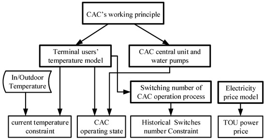 The terminal users in the CACCG will update their operating state according to the command they received; the ones in CACUG will also update their state based on the established model. Then, the CACG will wait for a new optimal target that is generated from SEUMER algorithm, and update the CACUG and CACCG, which react at the next time step. In this section, the data filtering valve, detailed models of CAC that consist of CAC central unit, cooling water pump, chilled water pump, and terminal users’ temperature are presented. Electricity prices model, and switching number model are also illustrated in this part. Figure 2 depicts the relation between different detailed models of CAC.