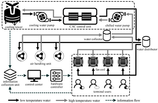 Figure 3 makes detailed descriptions for the working principle of CAC and basic configuration settings when considering the controlling module added in real application. Arrows of black, gray, and dashed line represent low temperature water, high temperature water, and information flow, respectively.