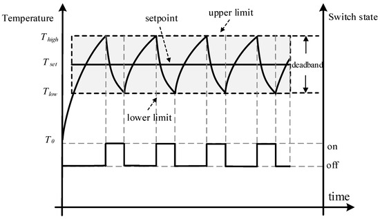 The indoor temperatures of terminal users are affected by many factors, including the switching states, setpoints, deadbands, outdoor temperatures, solar radiations, wall materials, and the output power of CAC at previous time step. When a terminal user is uncontrolled, its indoor temperature curve goes like that shown in Figure 4. Detailed descriptions of the temperature trajectory can be referred to our previous work [24]. At every time step, there are two CAC groups: open group and closed group: