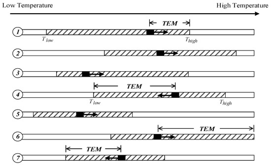 Figure 5 gives an intuitive explanation of TEM. The direction from left to right represents the increase of temperature, the shadow regions show operating temperature range of devices. The locations of the black cube indicate current devices’ status and the arrow indicates the direction of temperature extending. TEMs are variable under different operative conditions. When considering the diversity and characteristic of terminal users, deadbands, and upper and lower limits of devices should also be different. At time t, a corresponding TEM set of terminal units :