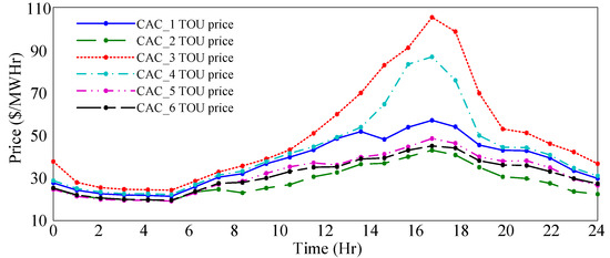 In this paper, we use time of use (TOU) pricing as our price model [25]. Time of use pricing is a kind of electricity pricing strategy based on time, which can reflect power supply cost in different periods. The peak electricity price and season electricity price are two kinds of TOU price that are commonly used in China. Through setting appropriate higher electricity prices in the rush hours of a day and lower prices during the off-peak, TOU can effectively improve the users’ behavior of power using, so as to achieve load shedding effect. Figure 7 represents several typical TOU prices [25].