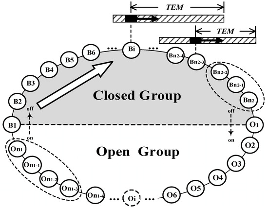 As shown in Figure 8, two controllable groups are formed according to their switching status. In each group, a number of terminal units are sorted by their NTEM, and move to the next location along the clockwise direction [24]. The intrinsic rule on how the devices’ temperature change can be found in Figure 4. As time goes, the NTEM of each device decreases continuously without any outside control in each group. This process can be seen as a constant motion in a clockwise direction.