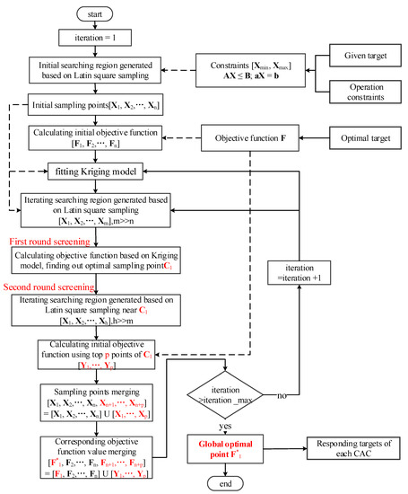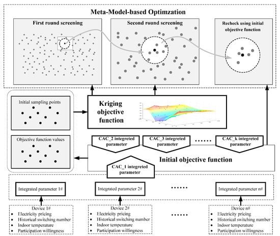 Figure 10 gives a description of the whole strategy structure. The constraints of a single device include four kinds of information: electricity pricing, historical switching number, indoor temperature, and user’s participation willingness. The constraints codetermine the integrated parameters that are different from each other. X stands for the targets needed to be calculated and distributed to the CAC response group. If there are five CAC groups, then there would be [X1, X2, X3, X4, X5] to be solved. A and B stand for the constraints matrix or vectors. To a single CAC, they are upper, lower power consumptions limits and the optimal target point, which is decided by the multi-dimension constraints. All of the parameters will be collected by the upper module, which formed the initial objective function. With the initial objective function and initial sampling points that are generated by Latin square sampling method, fitting Kriging objective function is obtained. After two rounds of screening, possible points are picked. Through rechecking and comparing the solutions using the initial objective function, we can find out the optimal point.