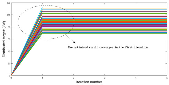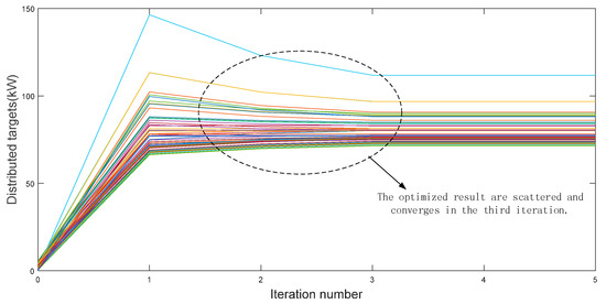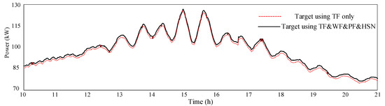 The influences of parameters’ customization are not only on the executive part, but also on the generating of optimizing target. from Equation (14), we know that the ideal optimal point is , and is determined by CAC users to a certain extent. Therefore, if a CAC user has larger , it means the users should undertake more target (load shedding or load rising). A case of load shedding is shown in Figure 24, two targets are generated using Equation (14) colored by black and red. The target using TF&WF&PF&HSN has smaller as it considers more factors, which are all in the range of 0~1. Thus, less load shedding target are distributed to it when compared with the CAC user only considering TF. By considering the parameters in the generating of optimizing target, CAC users can get reasonable targets, which match their response abilities.