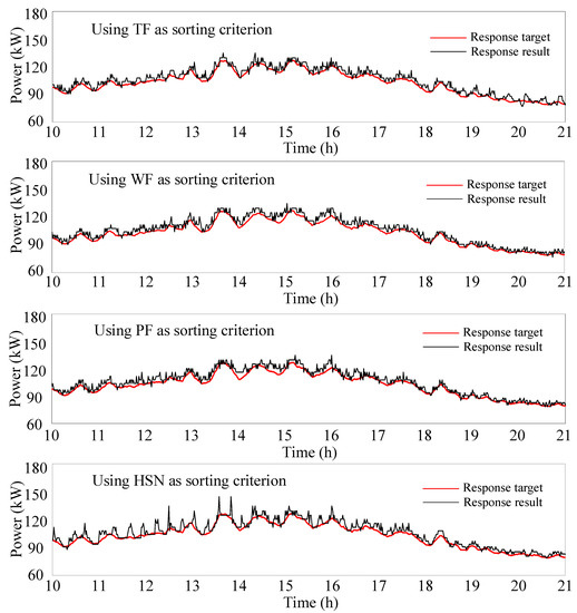 In this part, four key parameters temperature factor (TF), willingness factor (WF), pricing factor (PF), and historical switching number (HSN) are analyzed. Using single parameter as sorting criterion, that is, in Equation (11), set value 1 for one of the four weighting factors , and 0 for the other three weighting factors. With same targets and initial conditions, four response results and errors can be obtained, as shown in Figure 20 and Figure 21.