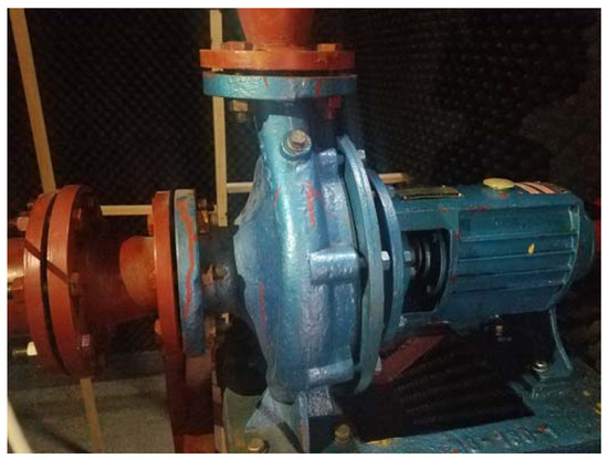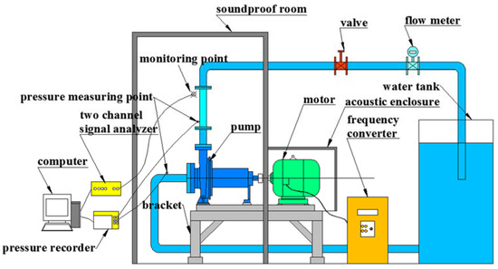 The experimental apparatuses used in the system are shown schematically in Figure 2, which include a soundproof room, water circulation system, circuit control system, and data acquisition and storage system. In the measurement system, to reduce the influence of the surrounding environment and motor operation on the measurement results, the centrifugal pump and motor are insulated by a soundproof room; the interior and exterior walls of the soundproof room, along with the motor, are surrounded by soundproof cotton. The pump is driven by the YVF2180L-2 type three-phase asynchronous motor (YVF2180L-2, Shanghai Nama Electric Co., Ltd, Shanghai, China), and the rotational speed is regulated by the Y0300G3 type frequency converter (Y0300G3, Shanghai Nama Electric Co., Ltd, Shanghai, China). The flow rate, inlet pressure, outlet pressure, as well as the radiation noise level are measured and recorded by corresponding instrument listed in Table 2.
