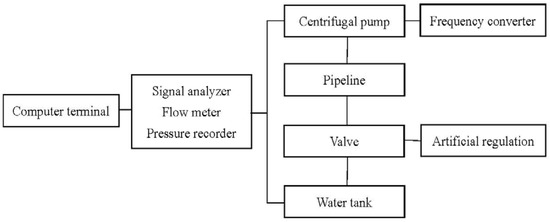 During the operation, when the operation system reaches stable, the flow rate, pressure, radiation noise level are measured sequentially and stored in the computer terminal. After that, the rotational speed and flow rate are adjusted via frequency converter and artificial regulation, respectively, then these parameters under various working conditions are recorded for analysis. Figure 3 shows the structure diagram of the measurement system.