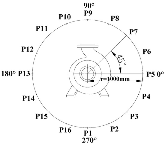 To acquire the distribution characteristic of radiation noise, 16 monitoring points are arranged on the measurement surface around the pump. As shown in Figure 4, the monitoring points are 1000 mm away from the center of impeller, and arranged evenly in circumferential directions [27]. During the measurement process, SPL characteristic of every point is measured sequentially by a microphone. Here, SPL is defined as: