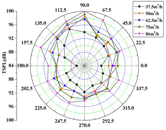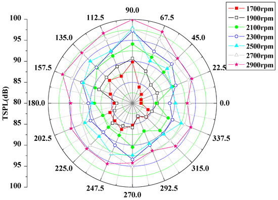 As shown in Figure 5, it can be found that the TSPL increases from 80 to 100 dB with the increase of rotational speed. As a result of the symmetric characteristic of impeller, the directivity profile diagram of TSPL demonstrates the dipole symmetry, and one sees that the two TSPL valleys appear at 0° and 180°. In addition, apparent asymmetric characteristics also can be found due to the asymmetric structure of the volute, more concretely, the noise level in the direction facing the tongue (in the interval from 90° to 157.5°) is higher than that in the direction against the tongue (in the interval from 292.5° to 0°), which means that the radiation noise is the interaction result of impeller and volute dipole source.