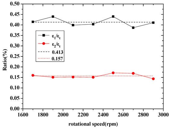 To further reveal the asymmetric characteristics under various rotational speed conditions quantitatively, the ratio of the acoustic energy in the interval from 90° to 157.5° (ε1), as well as that in the interval from 292.5° to 0° (ε2) to the total acoustic energy (εt) are calculated. As shown in Figure 6, the values of ε1/εt and ε2/εt change little with the change of rotational speed, and the value of ε1/εt fluctuates around 0.413, while the value of ε2/εt fluctuates near 0.157. This proves that the change of rotational speed would affect the acoustic energy, but it has little impact on the acoustic energy distribution. According to the past research [5,6,7], the volute tongue is the major noise source, and the measurement interval in the direction facing the tongue is closer to the tongue than other intervals. On the other hand, acoustic energy weakens gradually as the distance from the sound source increases, so the acoustic energy has less attenuation in the direction facing the tongue than that in the direction against the tongue, causing a much higher ratio of acoustic energy in the direction facing the tongue.