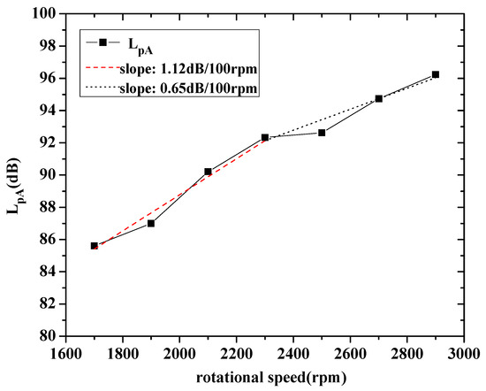 To evaluate the overall level of radiation noise, the LpA of the 16 monitoring points is compared in Figure 8 under various rotational speed conditions. It can be observed that LpA climbs gradually with the increase of rotational speed, and reaches to maximum at 2900 rpm. When rotational speed increases from 1700 to 2900 rpm, the LpA increases by 12.40%. However, the growth slope decreases gradually with the increase of rotational speed generally, in particular, the LpA grows rapidly in the interval between 1700 and 2300 rpm, with an average increase of 1.12 dB per 100 rpm, while in the range from 2300 to 2900 rpm, the growth rate of LpA slows down, with an average increase of 0.65 dB per 100 rpm, which is less than that in the range from 1700 to 2300 rpm. It could be explained by that with the increase of rotational speed, the pressure fluctuation on wall surface also increases, but the increment rate of the variance of pressure fluctuation decreases [29], and causes a slow increase in acoustic pressure around the pump, and as a result, the growth slope of noise level decreases steadily.