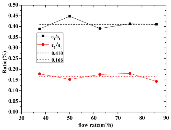 It is apparent in Figure 9 that TSPL changes between 86 dB and 100 dB, not only the dipole characteristic, but the asymmetric characteristic are presented in circumferential direction. And then the ratio of the acoustic energy in the interval from 90° to 157.5° (ε1), as well as that in the interval from 292.5° to 0° (ε2) to the total acoustic energy (εt) are compared under various flow rate conditions. As shown in Figure 10, the values of ε1/εt and ε2/εt show the fluctuation trend in the vicinity of 0.410 and 0.166, respectively. And these results are closer to those under various rotational speed conditions. It also can be found that the deviation between the value of ε1/εt and average value (0.410) is larger at 50 m3/h. It could be explained by that in the measurement process, the measurement results are affected by the severe disturbance of the surrounding environment, but it does not affect the conclusion that the change of flow rate also has little impact on the acoustic energy distribution.