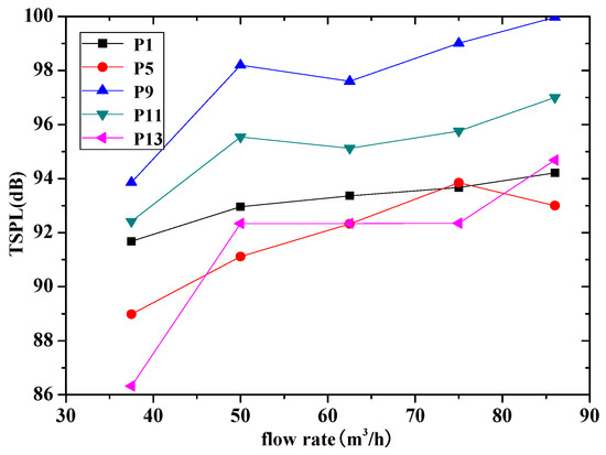 In Figure 11, TSPLs of P1, P5, P9, P11 and P13 are also analyzed to reveal the noise level changing rules under various flow rate conditions. It is revealed that TSPLs of different points show similarly changing rules, specifically, the TSPL increases rapidly in small flow range from 37.5 to 50 m3/h, then basically levels off in the interval from 50 to 75 m3/h, and continues to increase when flow rate is higher than 75 m3/h. What’s more, the TSPL distribution characteristic of different points under various flow rate conditions also shows that the noise level at P5 and P13 are lower than others, while TSPLs of P9 and P11 are higher than others, and P9 is highest noise level point, which coincides with the distribution under various rotational speed conditions.