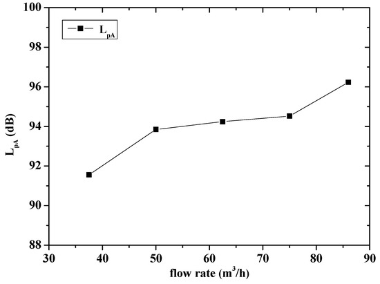 Furthermore, LpA of 16 monitoring points is also studied under various flow rate conditions. It can be found in Figure 12 that the LpA also increases sharply initially at small flow rate, then maintains stable, and reaches to maximum value at large flow rate interval. Additionally, LpA changes a little with the increase of flow rate, which increases by 5.10% when flow rate grows from 37.5 to 86 m3/h.