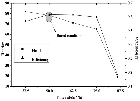 To explore the reasons for the changing rules of LpA under various flow rate conditions, the head and efficiency are calculated, respectively. The changing rules of the two parameters are shown in Figure 13, it can be found that with the increase of flow rate, the head decreases gradually. In addition, the efficiency shows the tendency that increases from 37.5 to 50 m3/h, and reaches to the maximum at 50 m3/h, then remains essentially unchanged in the range from 50 to 75 m3/h, which is the best efficiency range, and it keeps decreasing subsequently with the flow rate continues to grow. At low flow rate conditions, the pressure fluctuation inside the pump is low and causes low noise levels. With the increase of flow rate, the pressure fluctuation inside the pump increases accordingly, while in the best efficiency range, i.e., in the range from 50 to 75 m3/h, the pressure becomes stable [17], and leads to little change for the noise level. However, as the flow rate continues to increase, the head and efficiency decrease dramatically, which may be caused by the occurrence of cavitation inside the pump, and contribute to the dramatic increase of LpA when flow rate is greater than 75 m3/h.