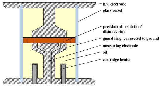 The design of the measuring electrode corresponds to the Cigre recommendation by [8]. The implemented pressboard barrier is designed in such a way that it is either a pure 2 mm oil gap or a 2 mm pure pressboard barrier. The diameter of the pressboard is equal to the diameter of the tube glass, thus preventing the barriers from slipping. In addition, holes are inserted to the outside, so that an oil curl is ensured. The combination of several kinds of barriers allows for the reproduction of any oil-pressboard insulation section. The object of investigation here is the basic arrangement: pure oil gap, pure pressboard, and the combination of oil and pressboard. In each way, the oil gap is located in an enclosed test volume, so that external influences are minimized [19].