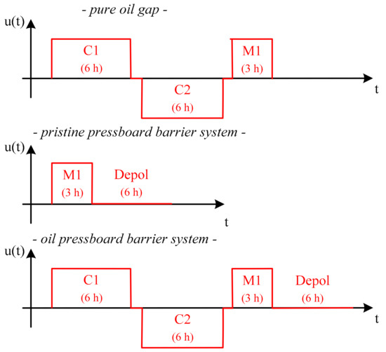 The voltage application in Figure 3 shows, before the technical measurement of the dc conductivity (see M1) is made, the pure oil gap and the oil pressboard barrier system, in contrast to the pristine pressboard barrier system, undergoes conditioning in both polarities (see C1, C2). It has been shown that, when measuring pure oil gaps, initially, the charge carriers are distributed freely in the volume and are subjected to a disordered heat movement. An application of voltage causes to the charge carriers to drift toward the electrodes and accumulate there as space charges [5]. Due to the random distribution and the different distances to the electrodes, this results in a turbulent measured current profile that is affected by outliers. In order to counteract this, a prior voltage conditioning is provided for the arrangement with additional oil gap. This ensures that a defined charge carrier distribution prevails in the oil gap and the current can be recorded without any outlier. For the pure pressboard arrangement, the voltage conditioning can be omitted. The reason for this is that the drift processes play a minor role in the pressboard and the polarization effects prevail. This can be exploited, for example, to shorten measurement times. As a consequence of the conditioning, the test vessel is subjected to both polarities. The voltage level is at least the level of the subsequent measurement. The duration is twice the measurement time of the technical measurement. The measurement phase “Depol” is performed after the measuring phase “M1”. In this measuring phase, the test vessel is short-circuited over a defined 11 MΩ resistor and the depolarization current is recorded for six hours. The measurement phase “Depol” of the pure oil gap was dispensed. It has been found that a 2 mm gap does not have any significant charge carrier storage for the used insulating liquids. Charge carrier storage, however, cannot be ruled out in the case of larger oil gaps, oil sections, or larger oil volumes, and is a current object of investigation.