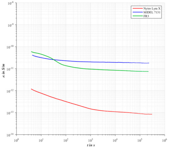 The evaluation of a pristine pressboard barrier impregnated with Nytro® Lyra X shows in Figure 5 the known behavior according to [24,25]. In contrast to a pure oil gap, a pronounced polarization behavior can be observed. It turns out that the insulating material is fully polarized and charged after three hours, resulting in a current that is determined only by the conductivity. The conductivity determined after three hours is 399 fS/m.