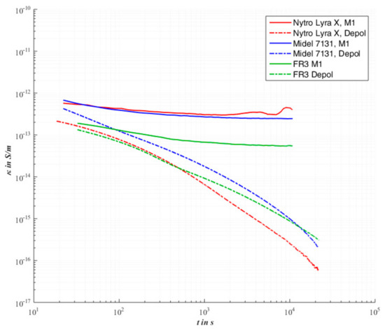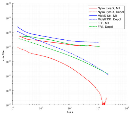 If the measurement is carried out under the same conditions with the natural insulating oil, see also Figure 6, a nearly identical polarization process is obtained in comparison to the mineral oil. The final steady state conductivity after three hours is also about 100 fS/m. The naturel insulating oil also has an unfinished depolarization process. This behavior is similar to Midel®7131, in the order of 10−15 S/m. The comparison to the arrangement pure pressboard in Figure 5 hardly shows any deviations in the total conductivity.