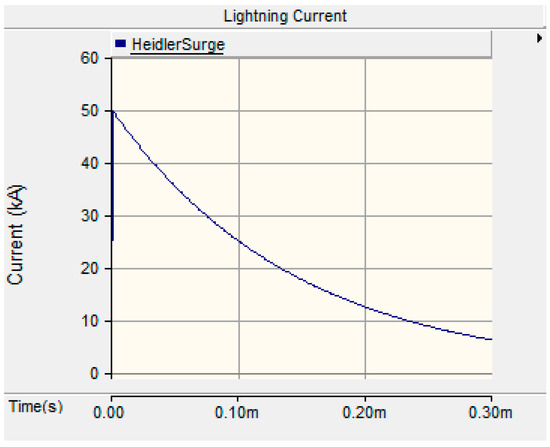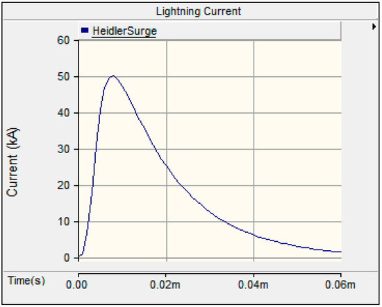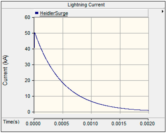 The double exponential function is the simplest equation for the representation of lightning current waveshapes, although the Heidler function provide more realistic results. The reason is that the Heidler function starts when , whereas the double exponential starts when µs. Therefore, the Heidler function was used in this study to model the lightning current waveshape.