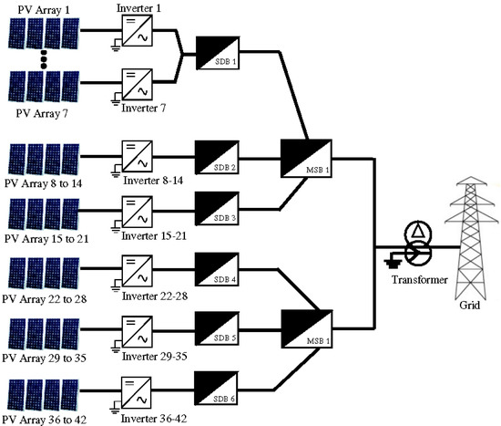 A solar PV farm grid-connected system (1 MW) was modelled in the PSCAD/EMTDC transient software. The model mainly consisted of a solar PV array, inverter (to convert DC to AC), transformer and grid, as shown in Figure 5.