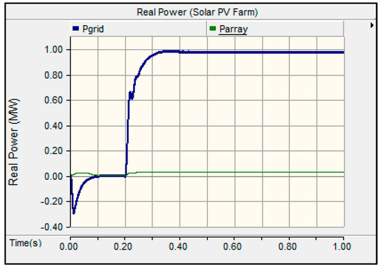 The solar PV farm was formed from 42 PV arrays, each of which delivers a maximum of 24 kW at 1000 W/m2 irradiance and 25 °C temperature at standard test conditions (STCs) [30]. Each solar PV array was built from 96 solar PV modules (250 W each) to form a 1 MW solar PV farm grid-connected system. In the simulation, the solar PV farm system generated 0.992 MW, which was equivalent to 99.2% efficiency (Figure 6) and the corresponding time to the steady state is 0.5 s. The remaining percentage (0.8%) was due to losses, which might have been originated from the inverters and cables.