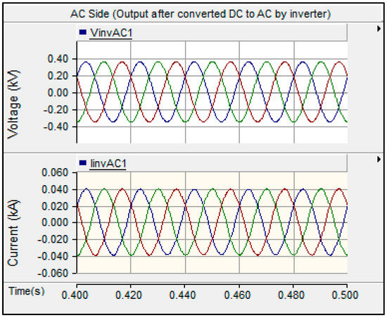 Theoretically, the inverter converted 715.2 V DC from the solar PV array to 353.54 V AC and maintained a unity power factor. The 353.54 V AC was connected to the grid by a 1.5 MVA 433 V/11 kV three-phase coupling transformer. In this simulation, the DC voltage and current output of the solar PV array is shown in Figure 7, while the AC voltage and current output can be seen in Figure 8. The output of the solar PV system is at steady state after 0.4 s.