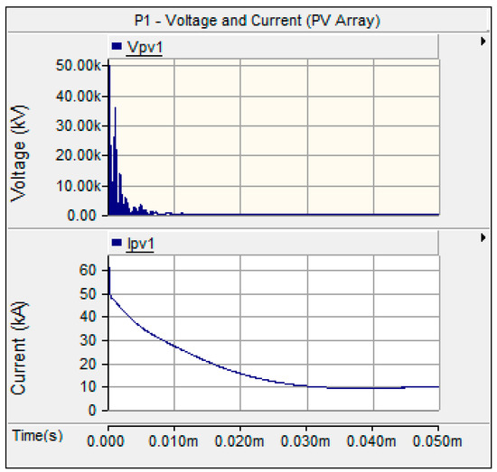 Transient voltage and current at P1 (solar PV Array 1).